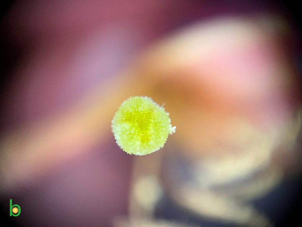 Het midden van de bloem trekt je aandacht. De stamper, warm van kleur en zacht van vorm, lijkt je bijna uit te nodigen.